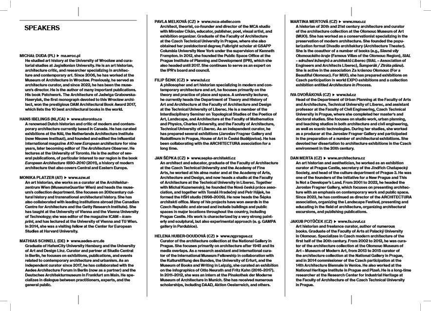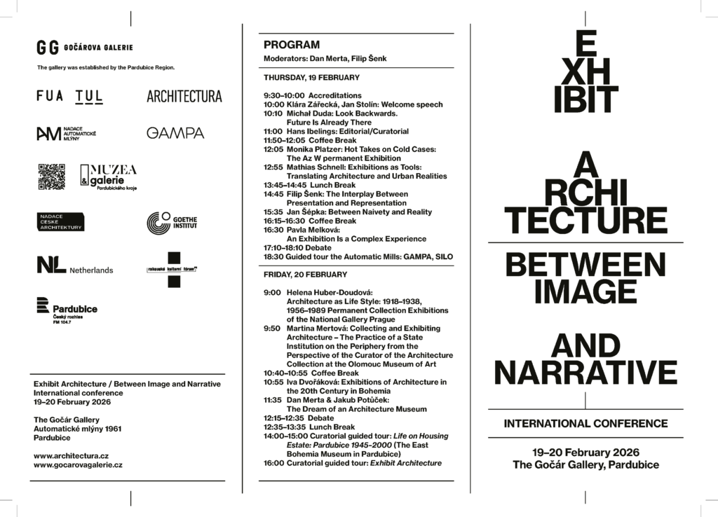 The exhibition and the eponymous accompanying book Exhibit Architecture (Gočár Gallery, Automatic Mills complex in Pardubice, October 4, 2025 – February 22, 2026) will be complemented by two-day international conference (February 19–20) featuring theorists, active artists, and architects.